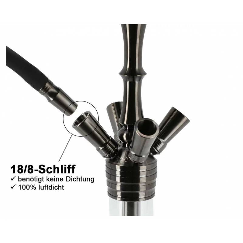 Für knapp 120€ bekommst du ein Set, das in dieser Preisklasse seinesgleichen sucht. Die technischen Schmankerl wie z.B. das verkürzbare Tauchrohr, oder die Schliffanschlüsse für Molassefänger kennt man eher von viel höheren Preisklassen. Dieses Komplett-Set von INVI lässt keine Wünsche offen! Wenn du Shisha-Neuling bist, oder einfach zu faul dir alle Einzelteile in unserem Shisha Online Shop zusammenzusuchen, dann hol dir die INVI Paradox Edelstahl Gun Metal Clear!